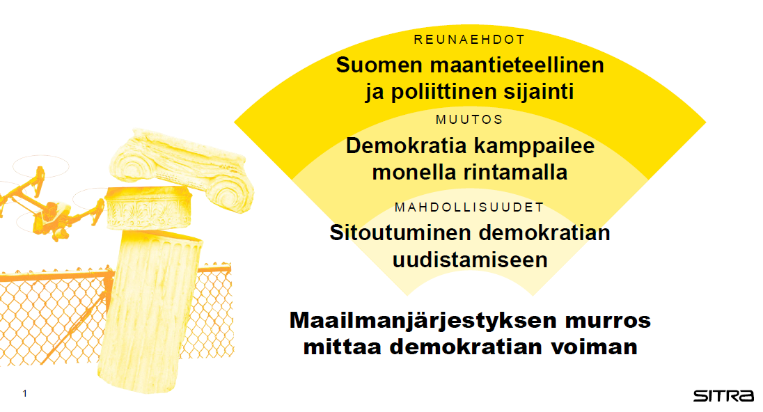 Kirjastot ovat toimineet suomalaisen demokraattisen yhteiskunnan rakentamisen peruspilareina ja edelläkävijöinä ajassa, jossa on joutunut taistelemaan oikeuksistaan. Miten kirjastojen tulisi tänä päivänä vaikuttaa, että kehityskulut tukisivat edelleen demokratiaa ja luottamuksen syntymistä? Voisiko äänemme olla voimakkaampi ja näkyvämpi osa yhteiskuntaa?